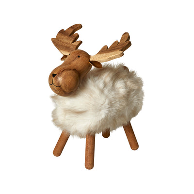 Figuren kombinerer naturligt træ i hovedet, benene og geviret med en blød, hvid pels, der minder om nyfalden sne. Det venlige ansigt og de detaljerede malerier spreder glæde, uanset hvor du placerer den. Brug den som en del af din juleudsmykning eller som et unikt statement-piece, der passer ind i enhver indretningsstil.
