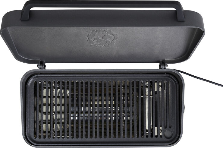 Kabinet i aluminium med bakelithåndtag og støbejernsrist. God stor grillflade på 40x18cm, så der både plads til kød og grøntsager på samme tid. Beslag til opsætning på gelænder kan tilkøbes.